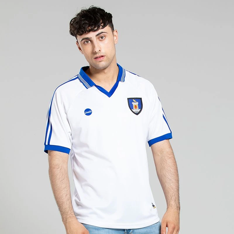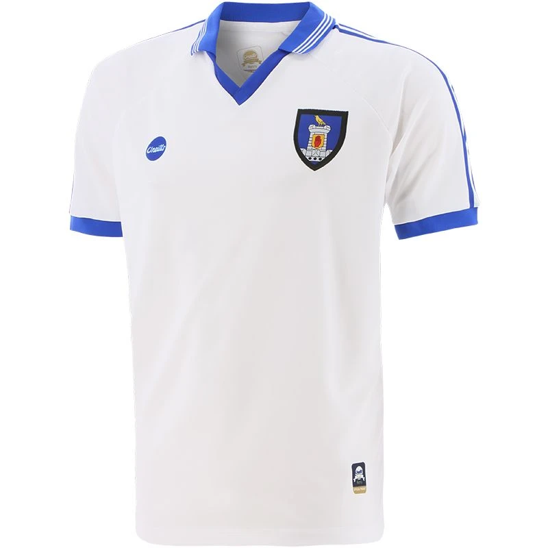 The Monaghan retro jersey has a minimalistic but classic look, featuring all the characteristics of a classic farney jersey, with a blue collar neck and stripe detail along the shoulders.